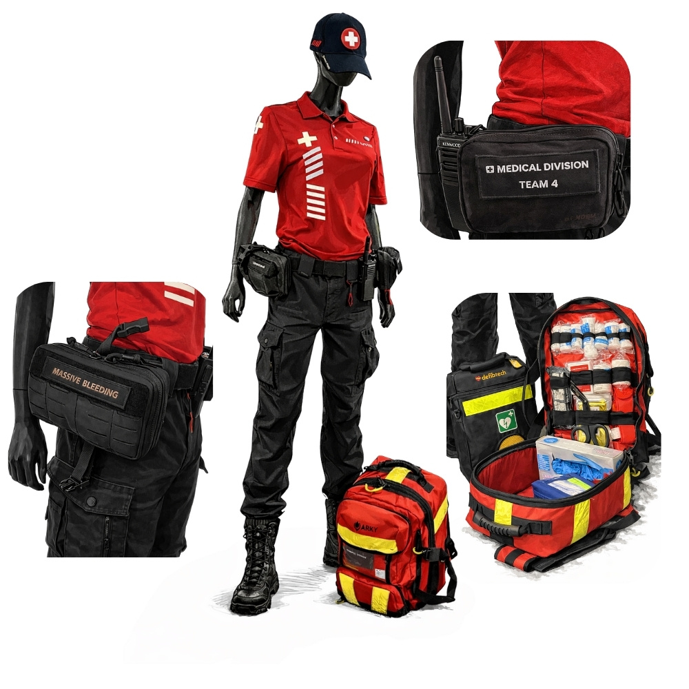 Daarnaast is er een AED en aanvullende BLS-uitrusting aanwezig voor acute situaties, en worden persoonlijke beschermingsmiddelen gebruikt om veilig en hygiënisch te kunnen werken. Wanneer een Zorgprofessional Basiszorg wordt ingezet binnen een Quick Response Force, is een deel van deze uitrusting ondergebracht in draagbare modules zodat ook in het veld verantwoorde basiszorg kan worden verleend. Dit alles gebeurt binnen de geldende bevoegdheden en conform de Veldnorm Evenementenzorg.